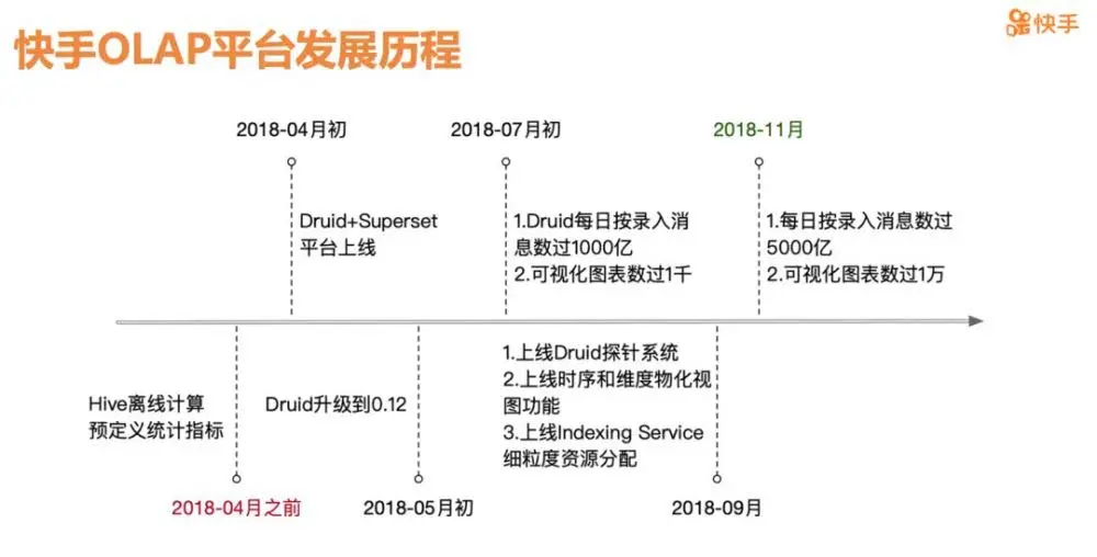 在今年 4 月份上线 Druid OLAP 分析引擎,加上 Superset 数据可视化平台,解决了不少业务的痛点。5 月,Druid 平台升级到了当时社区最新的 0.12 的版本,在升级过程中解决了时区、文件加载性能等问题。7 月,Druid 平台每天的录入消息数已经突破 1000 亿,用户配置的可视化图表也超过 1000 个。7 月份之后平台进入了一个快速发展的阶段,Druid 在查询性能和稳定性方面都出现了很多的问题,我们做了非常多的改进。9 月,上线了 Druid 探针系统、时序和维度物化视图功能、Indexing Service 细颗粒资源分配等,另外在资源调度层面也做了大量优化工作。截至今年 11 月,OLAP 平台每天摄入消息的数据量峰值已经超过 5000 亿,用户配置的可视化图表数已经突破 1 万。
