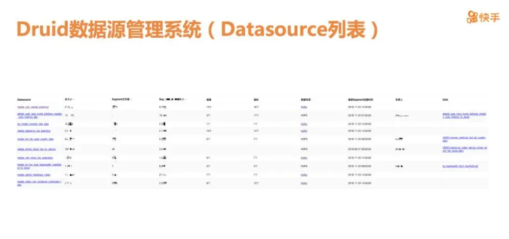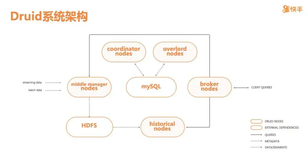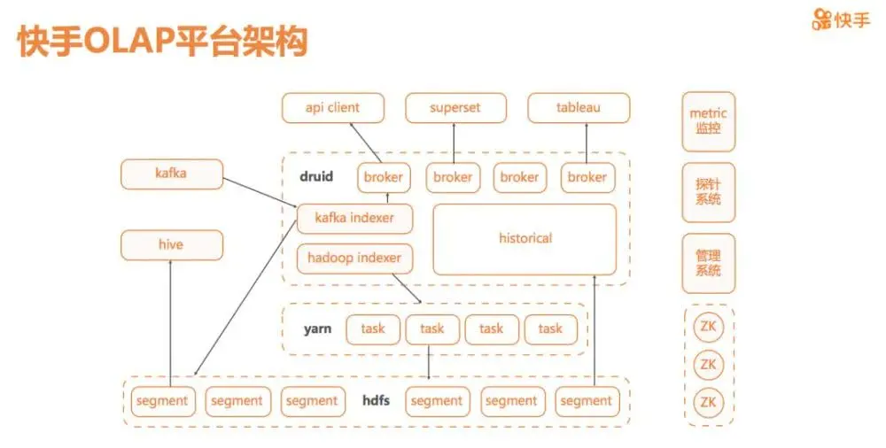 这是快手 OLAP 的平台架构图,中间部分是 Druid 自有的组件,数据通过 kafka 实时摄入和离线从 Hive 数仓中批量导入。除此之外,我们还配套了完善的 Metric 系统,探针系统、Druid 数据源管理系统等。