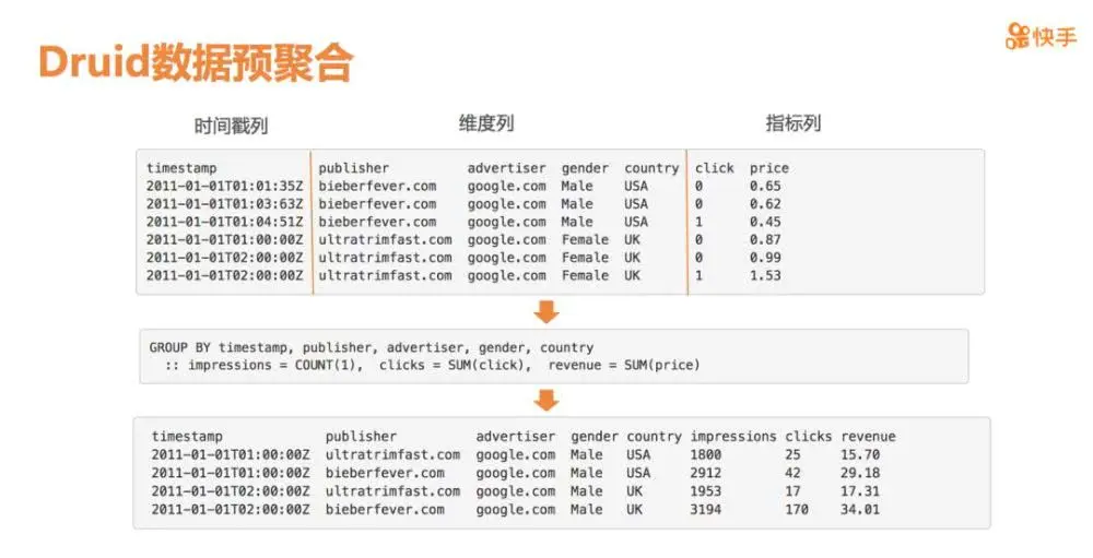 首先讲下数据预聚合。Druid 会把一行数据消息分成三个部分,包括时间戳列、维度列以及指标列。所谓预聚合,就是当数据录入到 Druid 系统时,会按照一定的时间周期把原始数据做一次预先聚合,会根据一个全维度聚合出要计算的指标,也就是要索引的内容。后续所有的查询都是通过这些预聚合的中间结果做二次查询。