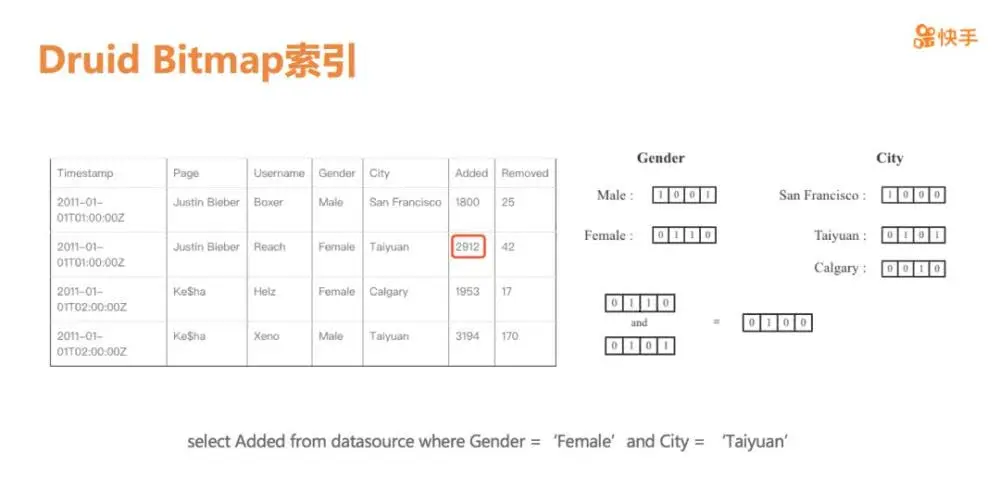 接下来讲下 Bitmap 索引。Bitmap 索引主要为了加速查询时有条件过滤的场景。Druid 在生成索引文件的时候,对每个列的每个取值生成对应的 Bitmap 集合。如图上所示,Gender 为 Male 对应的 Bitmap 为“1001”,代表第 1 行和第 4 行的 Gender 为“Male”。举一个查询的例子,假设要筛选 Gender =‘Female’and City =‘Taiyuan’的数据,那么只需要把 Gender =‘Female’对应的 Bitmap “0110”和 Taiyuan 对应的 Bitmap “0101”进行与操作,得到结果为“0100”,代表第二行满足筛选条件。通过 Bitmap 可以快速定位要读取的数据,加速查询速度。