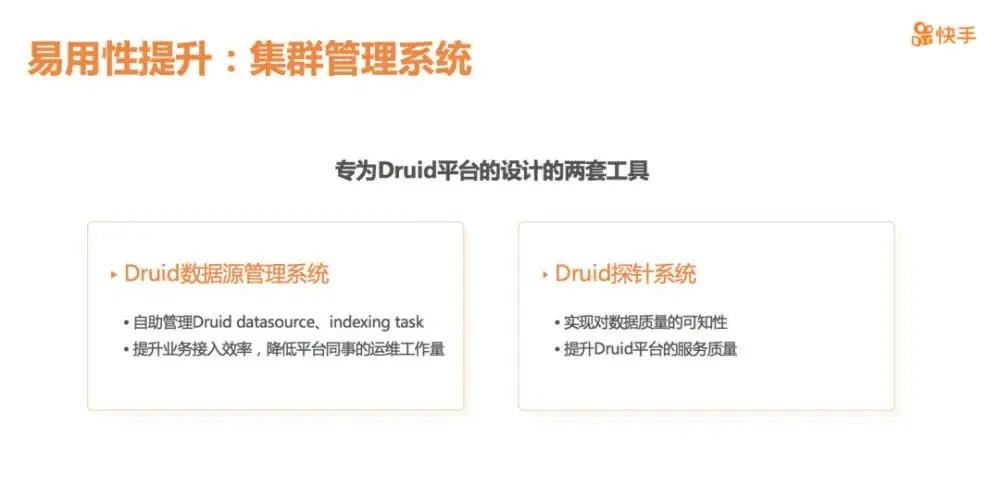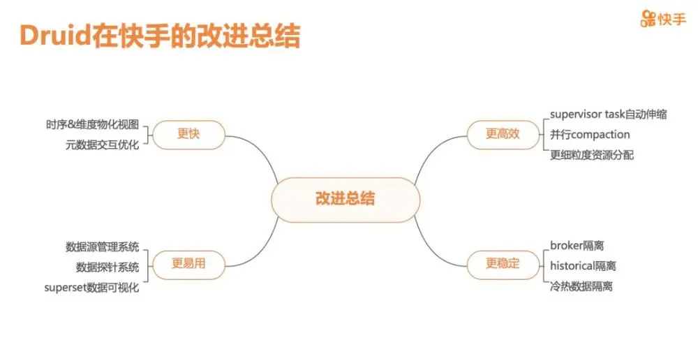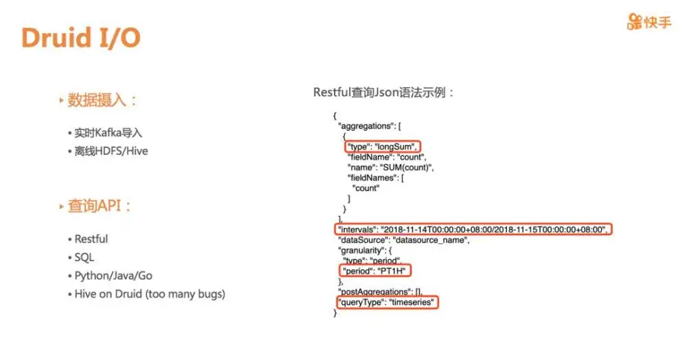 关于 Druid 模块,Druid 支持从 kafka 实时导入数据,同时也支持批量从 HDFS 或者 HIVE 系统进行离线导入;Druid 提供了丰富的查询 API 接口。除了默认提供的 Restful 接口之外,Python 、Java、Go 等编程语言都有第三方的实现 API 接口。此外,Druid 也提供了 SQL 接口的支持。值得一提的是,Hive 在 2.2 版本之后通过 StorageHandler 实现了对 Druid 的支持,这样可以通过 Hive SQL 查询 Druid 里的数据,快手内部也在用,但是需要做一些修改工作,比如解决时区问题、Druid 数据源维度和指标的大小写敏感问题,以及实现默认的 limit、默认时间范围选择等功能。
