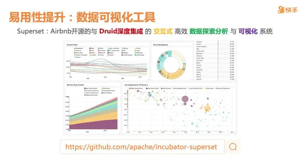在性能提升方面,我们做了时序和维度两个层面的物化视图以及元数据方面的交互优化。在资源管理层面,实现了 Supervisor indexing task 的自动伸缩、Middler Manager 细粒度资源分配以及并行 Compaction。在稳定性层面,设计了 Broker 和 Historical 的隔离部署。在平台易用性层面,自研了数据源的管理系统、数据探针系统,以及引入 Superset 数据可视化平台。