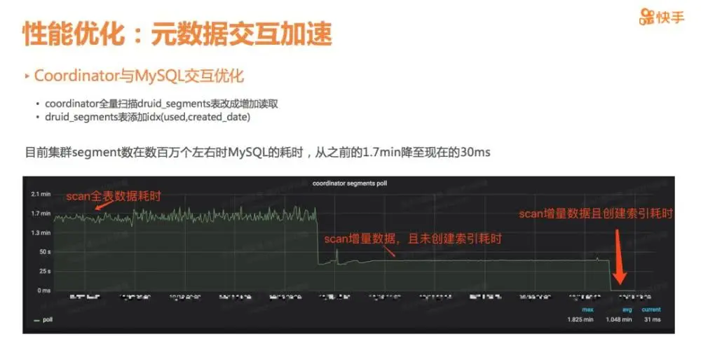 首先是 Overlord 与 MySQL 之间的交互优化。Overlord 在发布新的 Segment 文件的时候会多次查询 Segments 表,监控发现会有大量的慢查询。解决方案很简单,针对性地对 Segments 表增加索引即可。对比优化后的 MySQL 查询性能,可以从 10 秒多降到 1 秒,有 10 倍以上的提升。