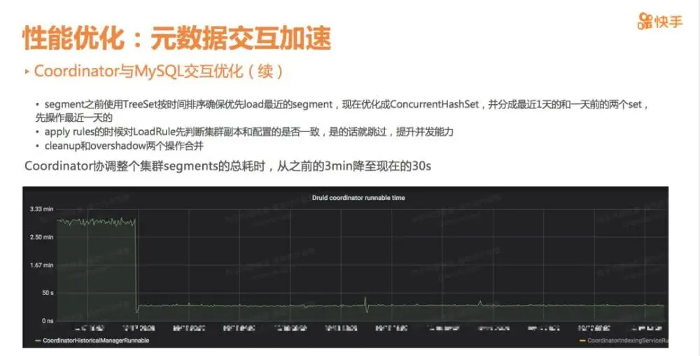 接下来是 Segment 文件加载过程的优化,Coordinator 扫描 segment 匹配 Rule 过程默认是串行实现的,我们对此做了并行化的加速,再加上一些细节点的改进。集群几百万量级的 Segment 文件协调一遍的耗时从原来的 3 分钟降低到现在的 30 秒。Druid 元数据系统通过如上几个点的优化后,目前基本上不再有性能瓶颈。
