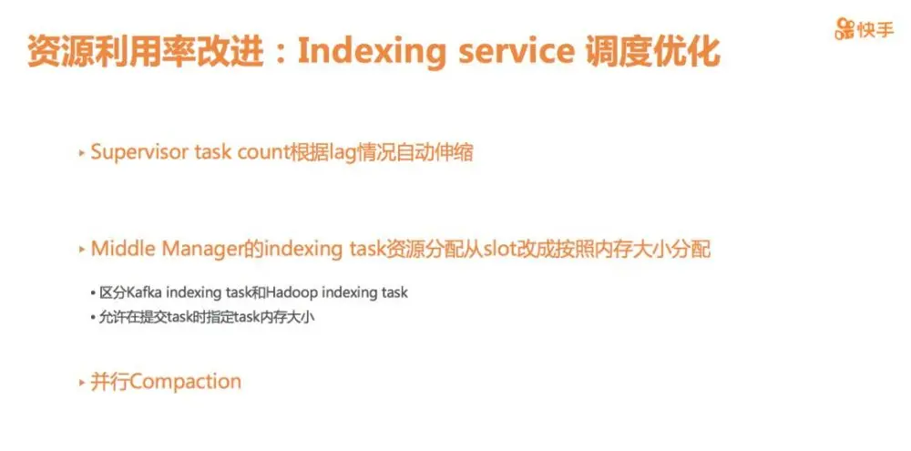 首先,每个 Kafka indexing task 会对应一个 Supervisor 的服务,Supervisor 的 task count 是一个固定的值,当用户设置 task count 比较小时,可能会因为读取 Kafka 的 lag 过大而出现数据延迟,而如果设置的过大会造成资源的浪费。另外,用户在创建一个 indexing task 的时候,也很难估算 task count 应该是多少合适。我们的优化方案是让 Supervisor 根据当前消费 Kafka 时延的情况,自动调节 task count,这样业务高峰期不至于出现数据延时,数据低峰期时也能把资源还给集群,整个集群的利用率有明显提升。