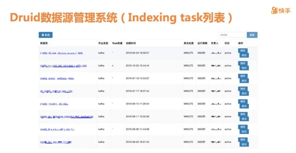 数据源的管理系统是一个 Web 管理系统,用户可以在这个系统上完成数据源接入、查看和管理,可以查看的信息包括维度和指标信息、Kafka 消费的速率、kafka 消费的 lag 等。上图展示的是数据源管理系统的 indexing task 列表信息,系统配有权限管理功能,只有数据源的负责人可以修改数据源的维度和指标等配置信息。