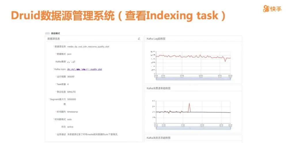 上图是 indexing task 详情页面,除了一些基础的信息之外,还可以看到像 Kafka 消费的速率情况,用户可以自主地去排查自己负责的数据源的线上问题。