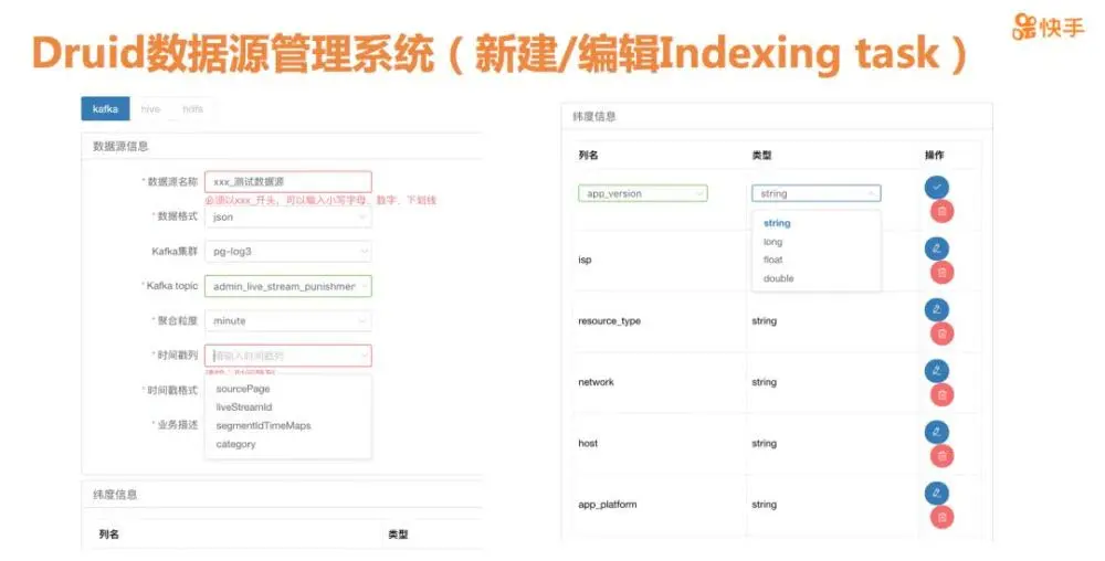 这张是数据源的新建和编辑页面。用户新建 Kafka 数据源的过程非常方便, 其中 Kafka 的信息是从 Kafka 的管理系统里面直接抽取出来的,用户不需要手动填写,直接点选即可。对于时间戳列和时间戳列的格式,系统会自动抽取用户 Kafka 的数据做填充,如果是用户写错了时间戳列的格式,也能够自动纠正过来。对于维度和指标系统也预先做了数据的解析提供 Suggestion,用户只要用鼠标点选即可。