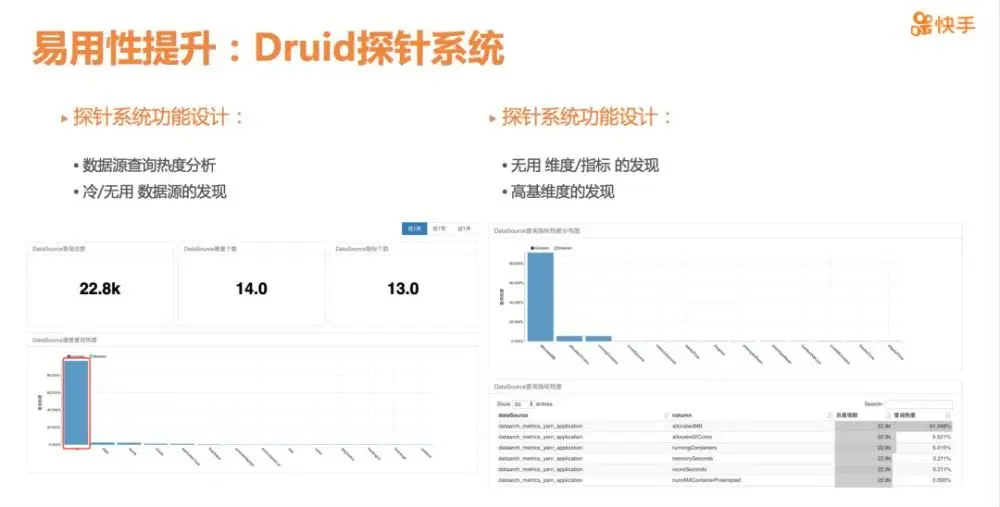第一,数据源查询热度的分析。探针系统会对 Druid 所有的数据源做总体的查询热度排名,这样管理员可以知道哪些数据源是查询的大客户,会做针对性的“关照”。此外,还可以发现一些没有查询请求的冷数据源或者僵尸数据源,并通知用户去做下线处理,避免占用集群的资源。