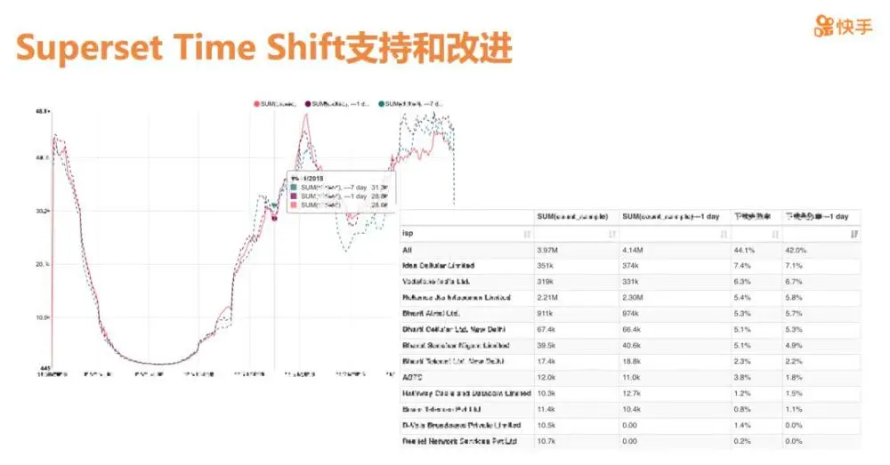 针对几个重点的改进点做下介绍,比如对多 time shift 的支持,所谓 time shift 就是可以在一张图里面同时绘制出来当前值与前一天同比和环比的指标对比。这里展示的是当前这一天与前一天,以及上周同天指标对比情况,用户可以加任意多的其他日期的指标对比到同一张图里面。除了这种时序线图之外,我们对其他图表也做了大量的 time shift 支持。