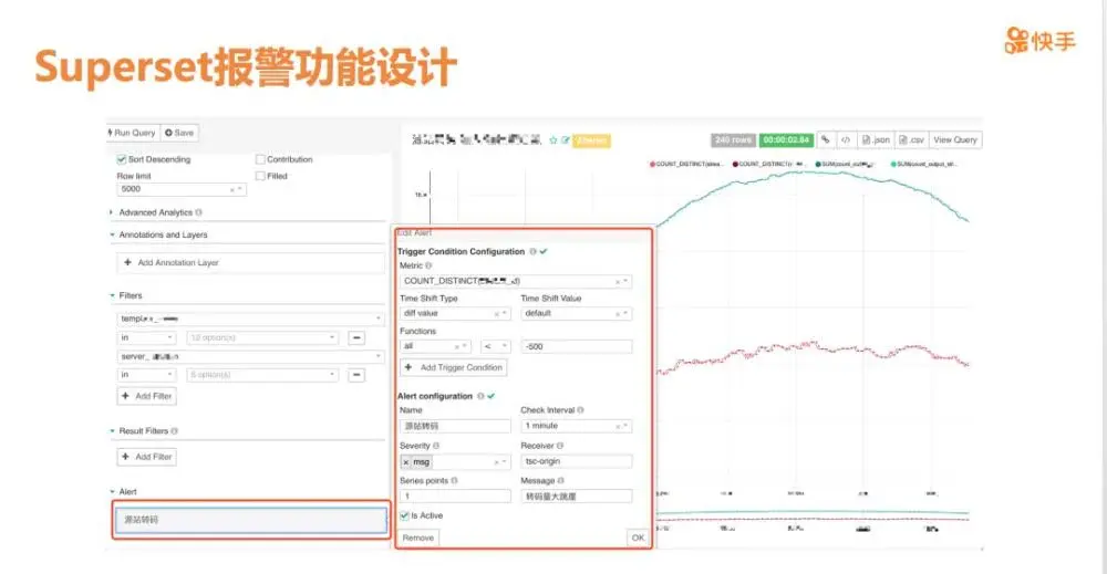 这里展示的是 Superset 报警功能的设计。公司很多监控数据都是依赖 Druid 和 Superset 做数据分析,对报警需求也是非常强烈。我们参考了 Grafana 的报警功能的设计,在 Superset 上也实现了类似的功能,用户可以在平台上自定义一些报警维度、指标、检查周期、报警级别等。