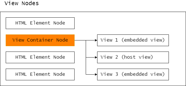 在Angular中只有这些视图类型,它们(视图)主要的不同取决于用什么输入数据来创建它们。并且嵌入视图只能附加(译者注:挂载)到视图容器中,而宿主视图可以被附加到任何DOM元素上(通常称其为宿主元素)。