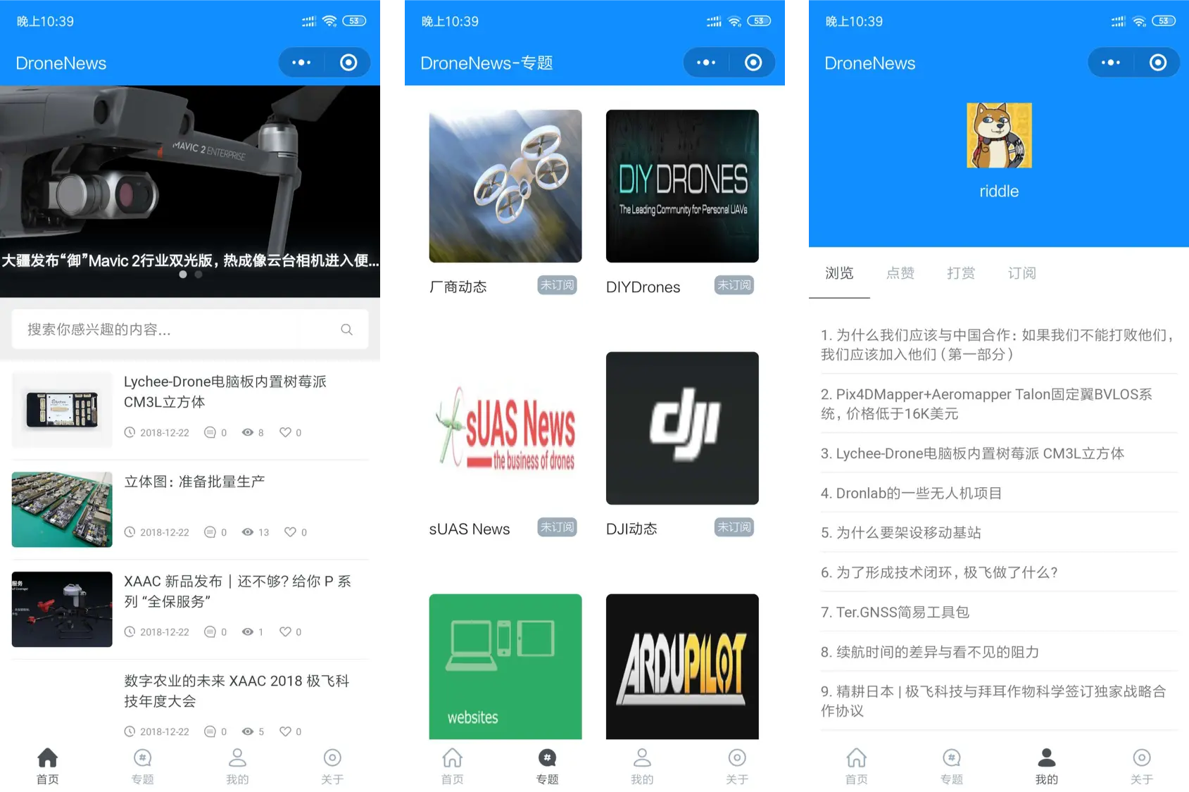 最近想了个套路,如何为社群产生更多的内容来吸引用户。经过几日的调研,决定了做一款可随时浏览各类无人机开发消息以及前沿新闻的小程序。可以理解为类似“36氪”之类的站,只是我的内容仅限于无人机相关,各类开发为重点,辅助以厂商新闻、世界前沿新闻。 这样是大家比较喜闻乐见的。