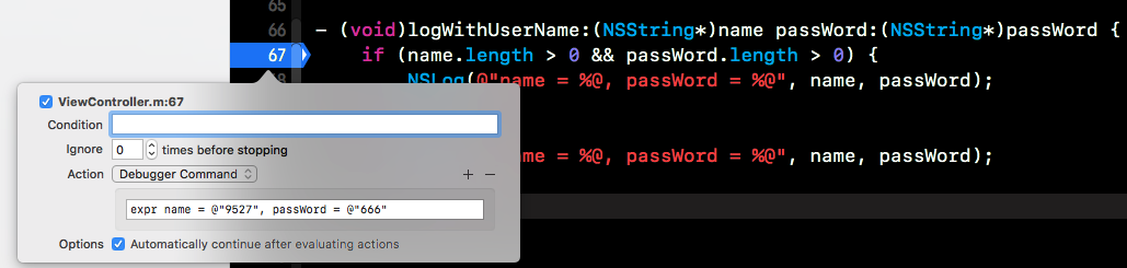 这里可以添加一些指定触发条件,比如添加第一个参数(arg3)不能为nil。这里arg4代表第2个参数,以此类推。这里也可以调用方法来判断,但必须是类方法,并且返回值必须为BOOL类型。 样例:找出给[UIImage imageNamed:]传nil的代码。这里就需要设置Symbol为