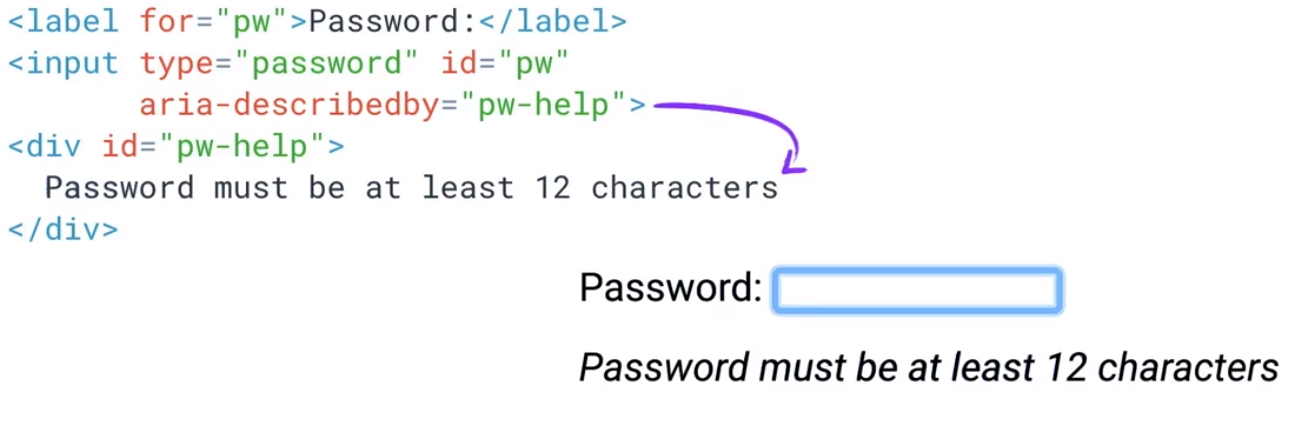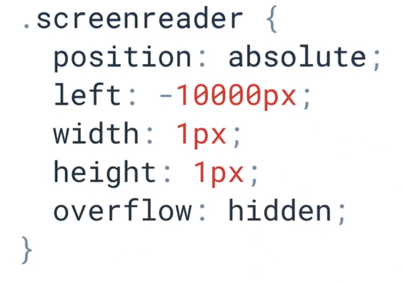 将DOM一些元素隐藏,可做如下的设置,也可以将为屏幕阅读器用户呈现的内容放在屏幕之外,aria-describedby引用隐藏的元素,添加aria-label(对辅助技术用户隐藏,隐藏的元素将不会出现在DOM树)