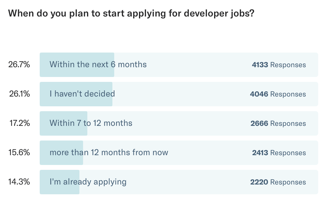 Of the respondents who aren’t yet working as developers, 58% plan to start applying for jobs in the next 12 months.
