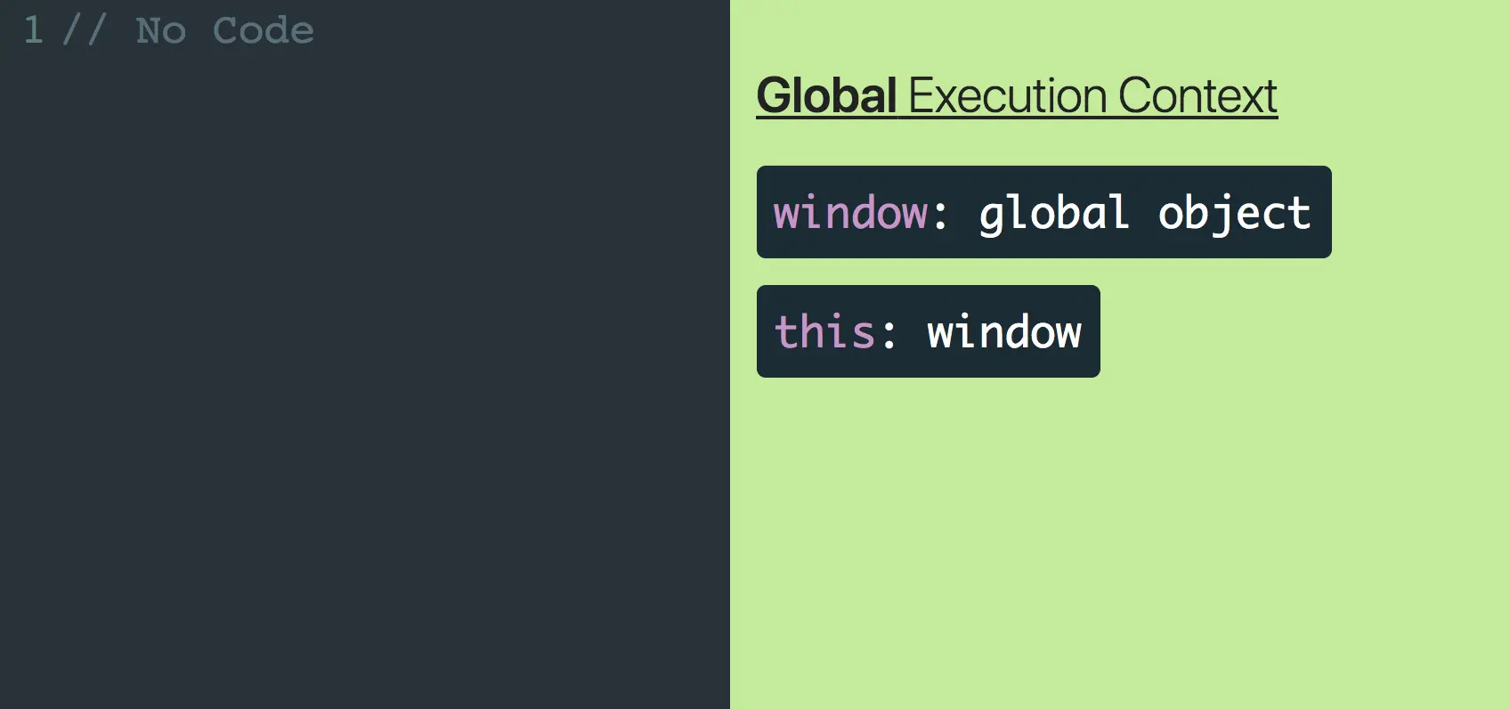 JavaScript引擎运行代码时创建的第一个执行上下文称为“全局执行上下文”。最初这个执行上下文将包含两个东西 - 全局对象和一个被调用的变量this。this将引用全局对象,如果在浏览器中运行JavaScript,全局对象就是window对象,如果是在Node环境中运行,全局对象就是global。