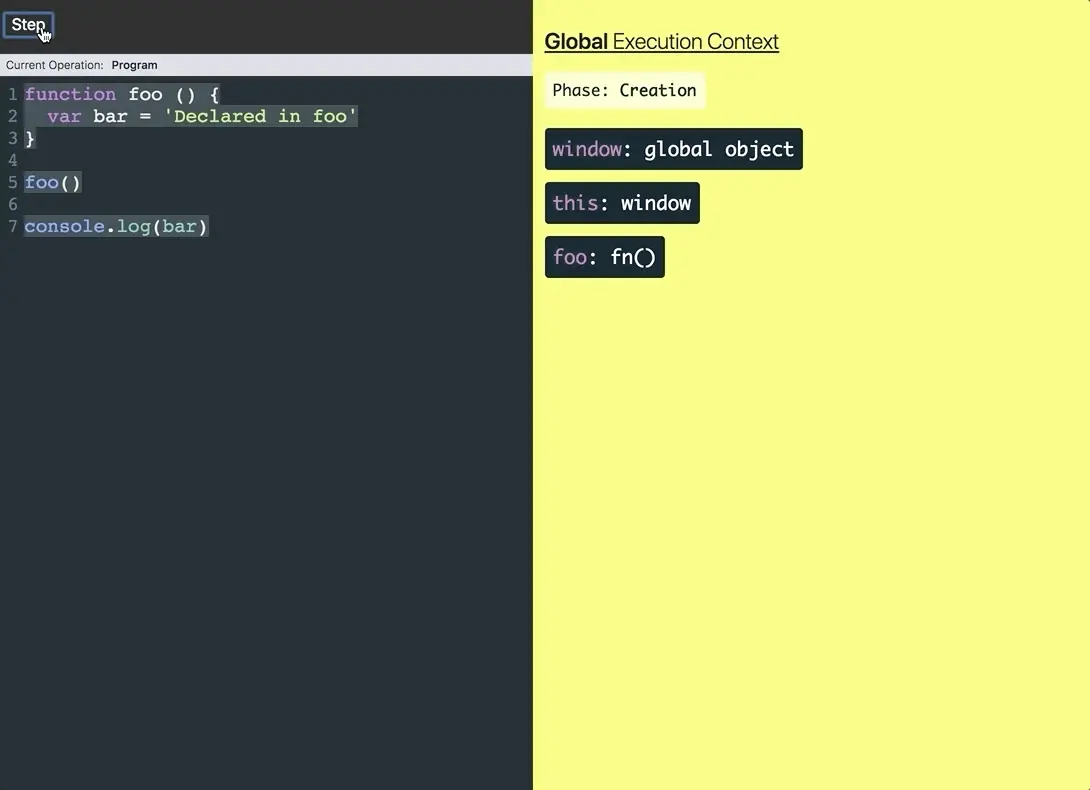 当foo调用我们创建的执行堆栈一个新的执行上下文。该Creation阶段创建this,arguments并设置bar到undefined。然后Execution发生阶段并将字符串分配Declared in foo给bar。之后,Execution阶段结束,foo执行上下文从堆栈中弹出。一旦foo从执行堆栈中删除,我们就会尝试登录bar控制台。在那一刻,根据JavaScript Visualizer,它似乎bar从未存在过,所以我们得到了undefined。这向我们展示的是,在函数内部创建的变量是局部作用域的。这意味着(大多数情况下,我们稍后会看到异常)一旦从执行堆栈中弹出了函数的执行上下文,就无法访问它们。