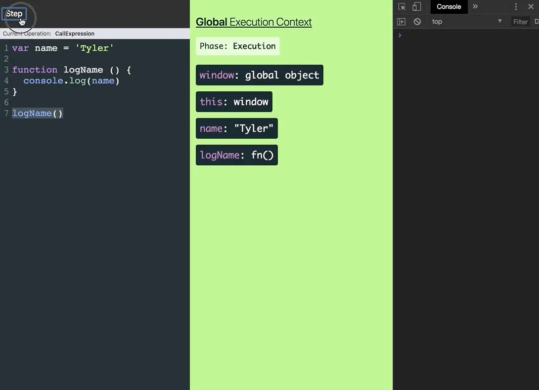 GIF很酷,但不像单步执行代码并亲自查看过程一样酷。因为你应得的,我为你创建了JavaScript Visualizer。如果你想查看上面的代码,请使用此链接。