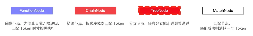 我们需要构造一个执行链条消费这些 Token,也就是可以执行文法扫描的程序。我们用四种类型节点描述文法,如下图所示: