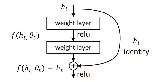 其中 h_t 是第 t 层隐藏单元的输出值,f 为通过θ_t 参数化的神经网络。该方程式表示上图的整个残差模块,如果我们其改写为残差的形式,即 h_t+1 - h_t = f(h_t, θ_t )。那么我们可以看到神经网络 f 参数化的是隐藏层之间的残差,f 同样不是直接参数化隐藏层。