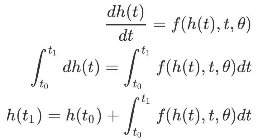 形式上来说,现在就需要变换方程 (2) 以求出数值解,即给定初始状态 h(t_0) 和神经网络的情况下求出终止状态 h(t_1):