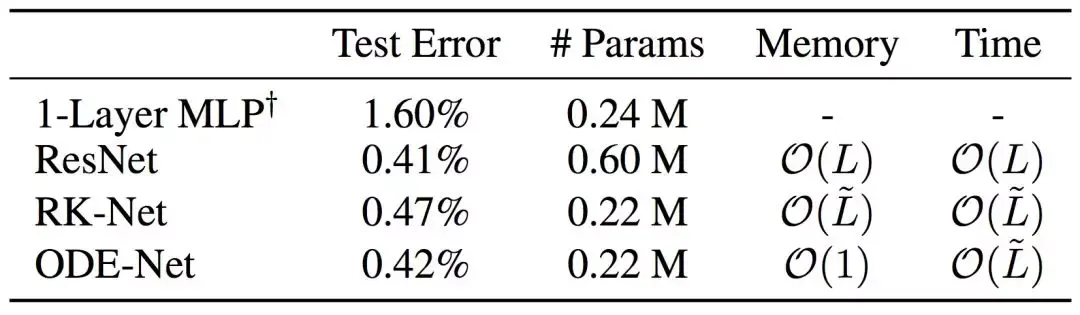 return ODESolver(f, h, t_0, t_1, θ)除了计算过程不一样,陈天琦等研究者还在 MNSIT 测试了这两种模型的效果。他们使用带有 6 个残差模块的 ResNet,以及使用一个 ODE Solver 代替这些残差模块的 ODEnet。以下展示了不同网络在 MNSIT 上的效果、参数量、内存占用量和计算复杂度。