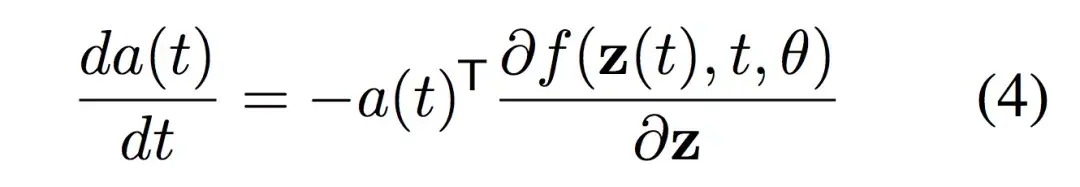 在基于链式法则的传统反向传播中,我们需要从后一层对前一层求导以传递梯度。而在连续化的 ODEnet 中,我们需要将前面求出的 a(t) 对连续的 t 进行求导,由于 a(t) 是损失 L 对隐藏状态 z(t) 的导数,这就和传统链式法则中的传播概念基本一致。下式展示了 a(t) 的导数,它能将梯度沿着连续的 t 向前传,附录 B.1 介绍了该式具体的推导过程。