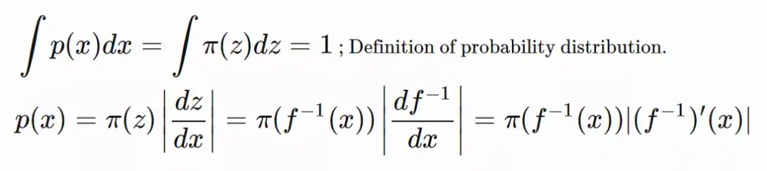 通过定义,积分项 ∫π(z)dz 表示无限个无穷小的矩形面积之和,其中积分元Δz 为积分小矩形的宽,小矩形在位置 z 的高为概率密度函数 π(z) 定义的值。若使用 f^−1(x) 表示 f(x) 的逆函数,当我们替换变量的时候,z=f^−1(x) 需要服从 Δz/Δx=(f^−1(x))′。多变量的变量代换定理可以从单变量推广而出,其中 det ∂f/∂z 为函数 f 的雅可比行列式: