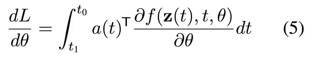 在获取每一个隐藏状态的梯度后,我们可以再求它们对参数的导数,并更新参数。同样在 ODEnet 中,获取隐藏状态的梯度后,再对参数求导并积分后就能得到损失对参数的导数,这里之所以需要求积分是因为「层级」t 是连续的。这一个方程式可以表示为: