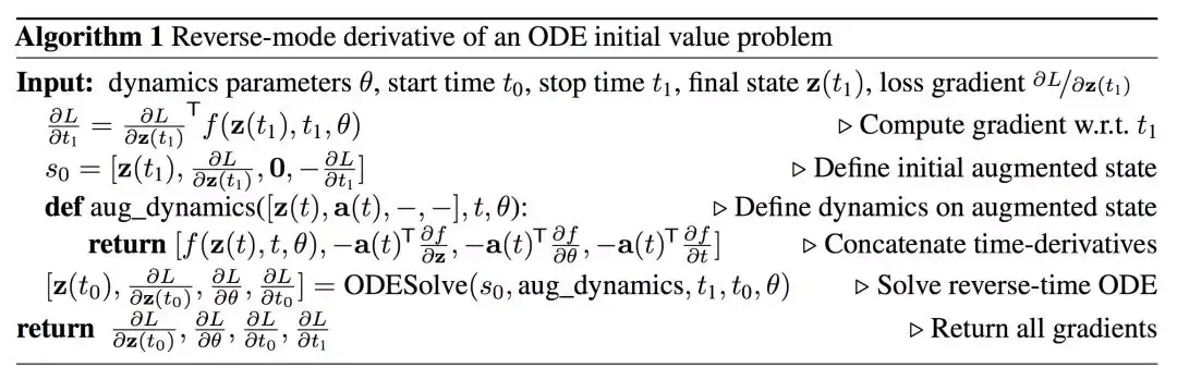在算法 1 中,陈天琦等研究者展示了如何借助另一个 OED Solver 一次性求出反向传播的各种梯度和更新量。要理解算法 1,首先我们要熟悉 ODESolver 的表达方式。例如在 ODEnet 的前向传播中,求解过程可以表示为 ODEsolver(z(t_0), f, t_0, t_1, θ),我们可以理解为从 t_0 时刻开始令 z(t_0) 以变化率 f 进行演化,这种演化即 f 在 t 上的积分,ODESolver 的目标是通过积分求得 z(t_1)。