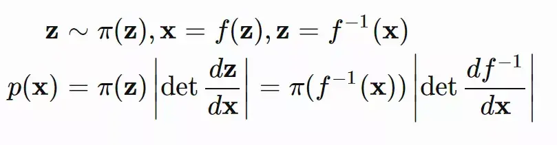 对于概率密度估计中的变量代换定理,我们可以从单变量的情况开始。若给定一个随机变量 z 和它的概率密度函数 z∼π(z),我们希望使用映射函数 x=f(z) 构建一个新的随机变量。函数 f 是可逆的,即 z=g(x),其中 f 和 g 互为逆函数。现在问题是如何推断新变量的未知概率密度函数 p(x)?