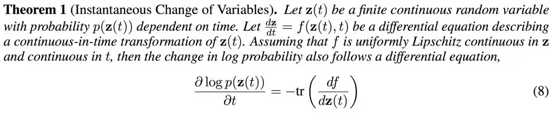 此外,连续型流模型还有很多性质与优势,但这里并不展开。变量代换定理 1 在附录 A 中有完整的证明,感兴趣的读者可查阅原论文了解细节。