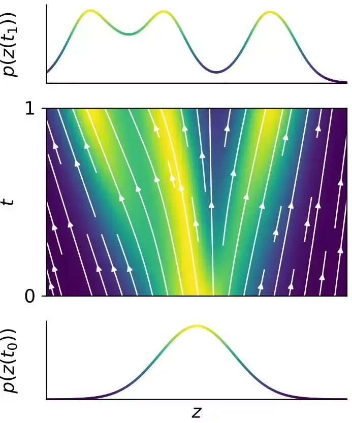 如下所示,随机变量 z(t_0) 及其分布可以通过一个连续的转换演化到 z(t_1) 及其分布: