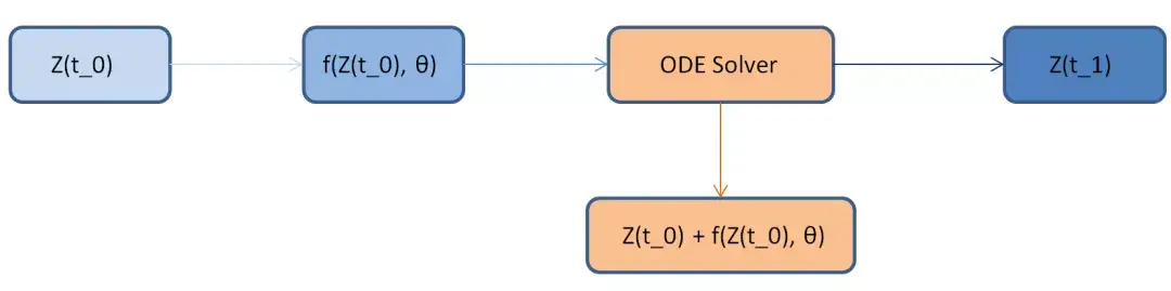 如上所示,常微分方程的数值解 h(t_1) 需要求神经网络 f 从 t_0 到 t_1 的积分。我们完全可以利用 ODE solver 解出这个值,这在数学物理领域已经有非常成熟的解法,我们只需要将其当作一个黑盒工具使用就行了。