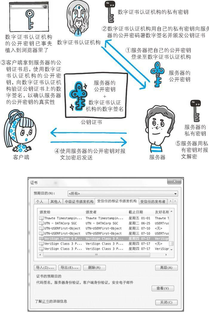接到证书的客户端可使用数字证书认证机构的公开密钥,对那张证书上的数字签名进行验证,一旦验证通过,客户端便可以明确两件事情: 1、 认证服务器的公开密钥是真实有效的数字证书认证机构。2、服务器的公开密钥是值得信赖的。