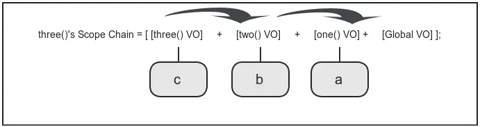 当执行到three 的执行环境时,此时 a和b 都不在c 的变量内,因此作用域链则起到了引用外部执行环境变量的作用。ES3中创建的作用域链如图: