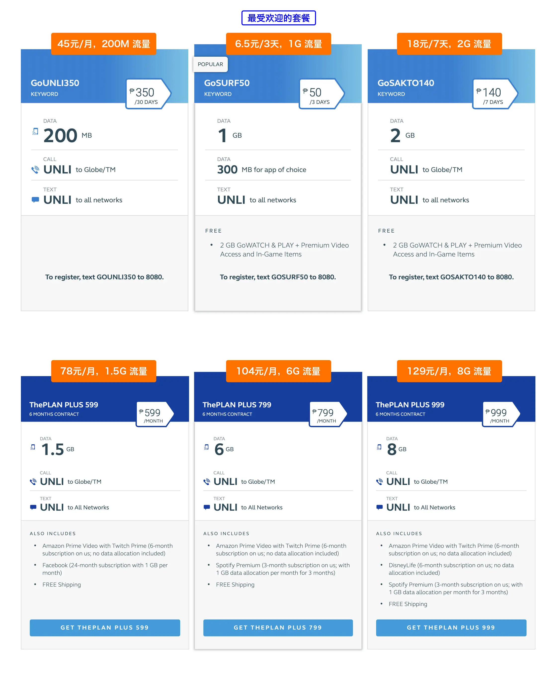 以当地一家名叫 Globe 的手机网络运营商为例,他们的套餐资费分为预付费和后付费。以下是两种付费方式各自最便宜的三种套餐。