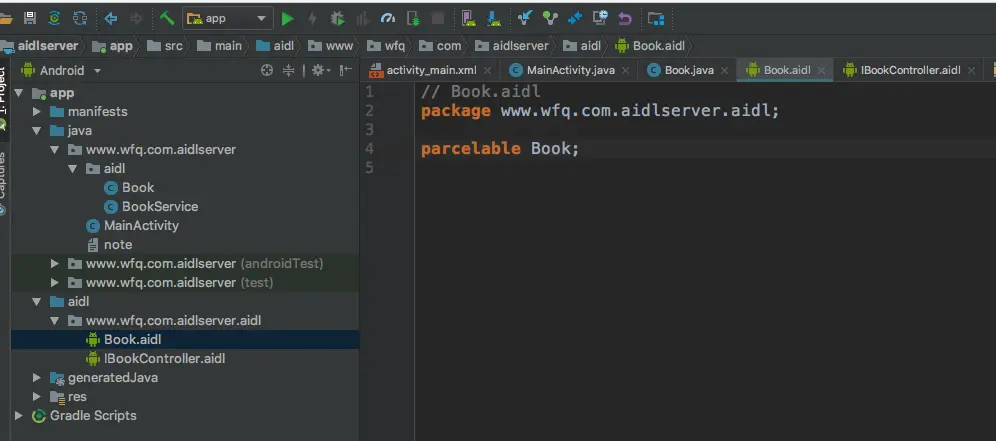 - 在该文件夹下面新建Book.aidl类,(这个时候Android Studio会自动在与java同级的目录下面生成aidl文件夹,并且刚才新建的Book.aidl文件也在该目录下面)