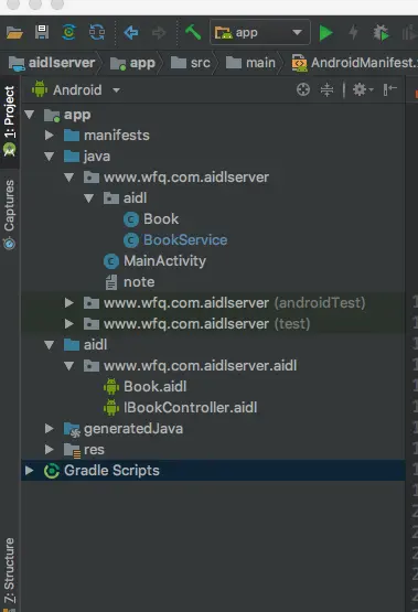- 在aidl文件夹下面新建BookService,用来作为服务跟客户端通信