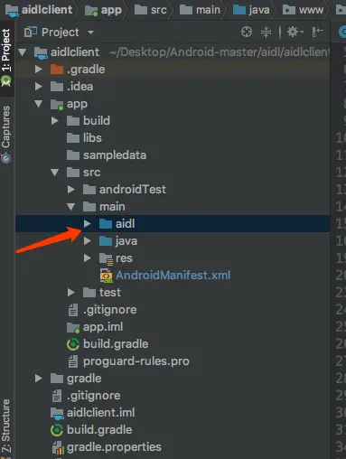 - 将服务端中Android Studio为我们生成的整个aidl文件夹拷贝到客户端,不要换包名,所在位置跟在服务端的位置一样(在拷贝文件夹的时候,可以将目录结构调整为Project模式)