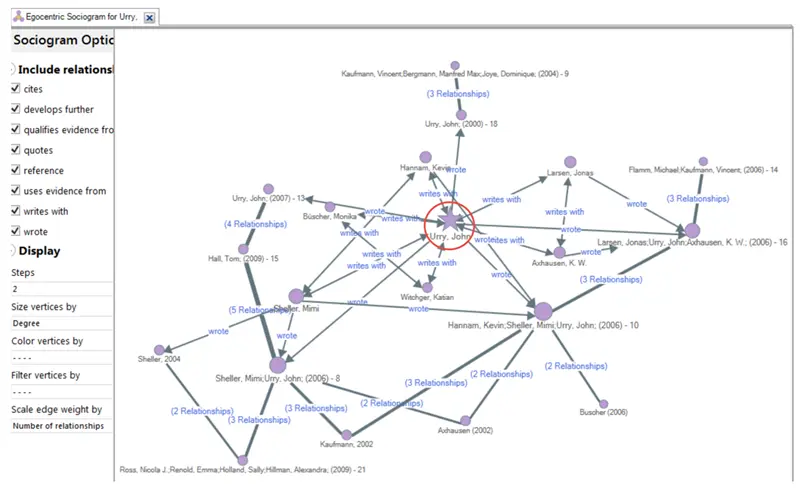 一旦完成了作者之间关系的搜索,可以使用自我中心社会图来探索一个特定的作者,看看他们写了什么,谁引用了他们的文章。右键单击作者的案例节点并选择自我中心社会图: