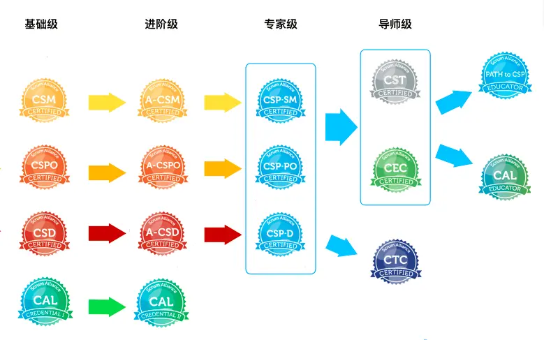 基础级认证包括ScrumMaster认证(CSM), ProductOwner认证(CSPO),Scrum开发者认证(CSD)。