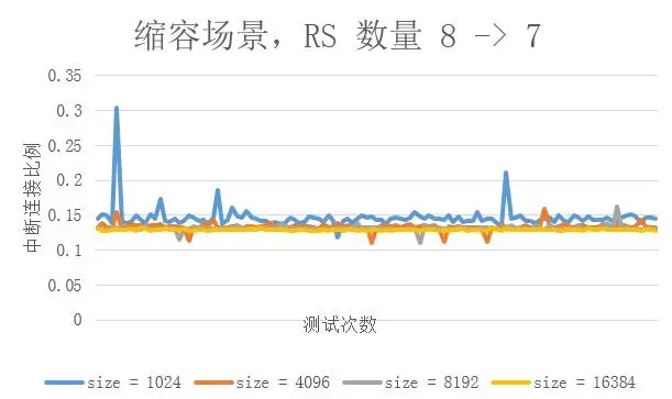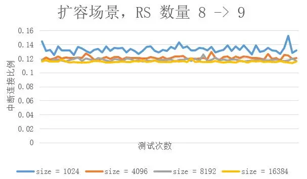 在Maglev项目中,通过Connection Track表来弥补这一缺陷,然而Connection Track将带来一系列缺点,使得NAT64 Access有状态,易于收到攻击。从论文中可以看出,当Lookup表的size大于后端节点的100倍时,连接中断的情况低于2%。但是2%还是一个相对比较高的比例,本着严谨的态度,我们在扩容和缩容(缩容也对应某台NAT64服务器Down机)场景下又针对Lookup表size与后端节点的比例进行了一系列测试与验证。
