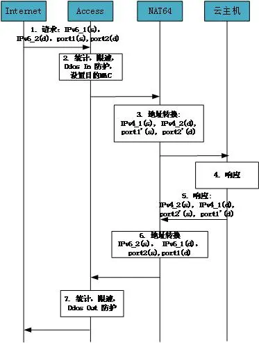 需要说明的是,在实际部署中,物理交换机2和1通常合一部署,形成NAT64 Access以旁挂的形式存在。下面以云主机为例,通过业务流程来简要说明整个系统的工作机制: