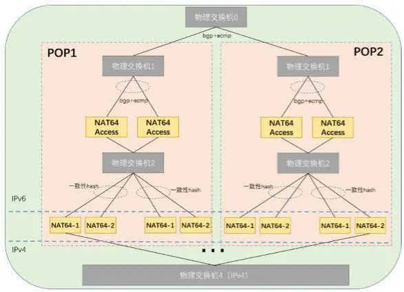 NAT64 Access与物理交换机1组成三层网络,通过BGP向物理交换机1宣告一个/96的IPv6地址段,作为该地域的IPv6 prefix。POP1与POP2中Access向外宣告的地址段相同,实现负荷分担和POP点级别的容灾。同理,POP点内两个Access之间也是负荷分担和容灾。