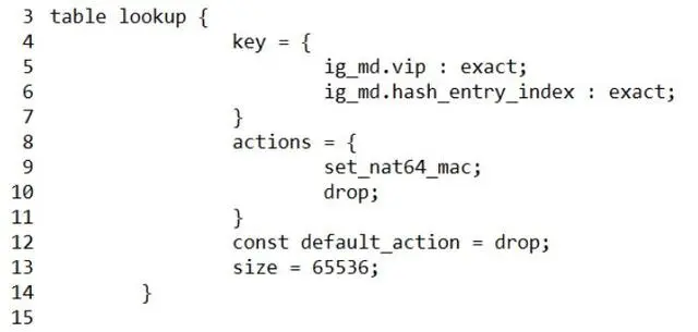 当数据面收到报文时,将根据EIP查询到VIP(通过另外的表以及控制面相应逻辑实现,在此不再展开),然后根据数据包的源IP、目的IP、源端口、目的端口、调用P4语言的Hash函数通过计算得到entry index,最后根据VIP和entry index匹配Lookup表,设置目的MAC,至此就完成了后端服务节点的选择。