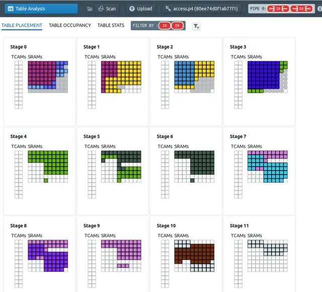 优化表配置,或者修改一定的业务逻辑,减少表之间的相互依赖,这样能够大大提高stage资源的利用率; 由于ingress和egress虽然共享stage,但是ingress和egress的表之间从硬件层面没有任何依赖关系。因此将业务逻辑拆分,一部分放于ingress,另一部分放于egress。这种方案比较简单易行,且通常收效明显; Pipeline串行,拆分业务逻辑,每个pipeline放置一部分业务逻辑,不同pipeline之间通过自定义metadata传递信息。这种方案也是一种行之有效的方案,且能够提升Tofino整体的表项空间,可以预见未来可能会有很多这样的应用。 在NAT64项目中,我们采用了1和2结合的方案,经过优化后,资源利用率达到百分之七十左右(没有优化之前只达到百分之三十左右)。下图是我们优化后Tofino芯片的资源利用图和Table占用图。