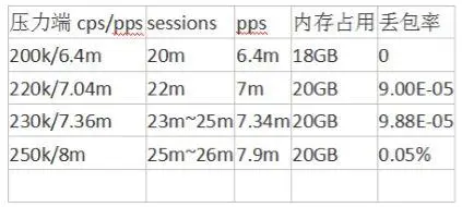 系统构建完成后,我们针对单台NAT64(NAT64服务器配置为CPU:32核;内存:64GB;网卡: X710 10Gb * 2)服务器进行了完整的性能测试,client是IPv6,server端是IPv4 双向udp数据流,一应一答。client发送请求到server,server端应答回到client。其中最为关键的CPS和并发连接数指标测试结果如下:
