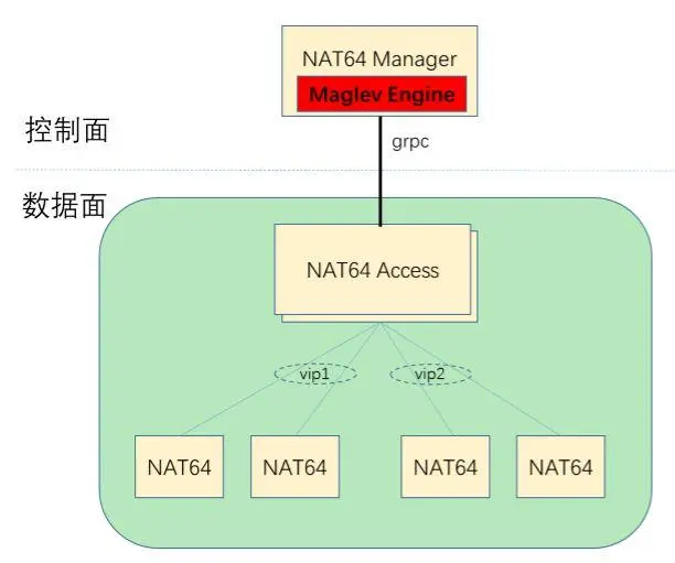 NAT64 Manager将持续监控NAT64 Access的路由表以及邻居表,一旦某个VIP的下一跳发生了改变(比如扩容场景或者某个NAT64 Down),将重新调用Maglev Hash Engine重新生成该VIP对应的Lookup表中对应的那部分entry,并通过GRPC修改相应的entry,实现节点变化时的快速响应。